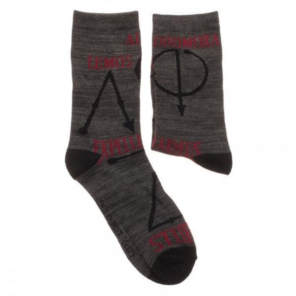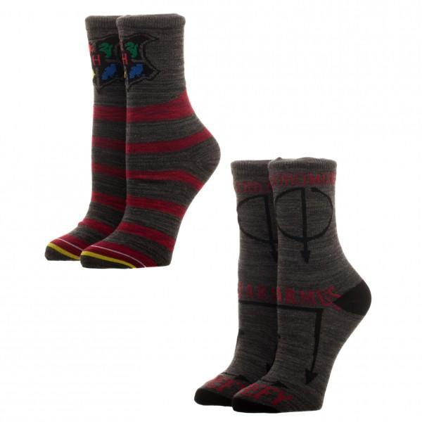 Do wizards magically knit their own socks using some sort of household spell, like, "Sockitosa Purlious"? We're willing to bet that this Harry Potter 2 Pack Jrs. Crew Sock is magically made by house-elves or something - and if you want to mix them up so they don't match, a la Dobby, go for it. The set includes one pair of gray-and-red striped socks with the Hogwarts crest knit into the shin, and the other is gray with a pattern red and black spells and deconstructed pieces of the Deathly Hallows.