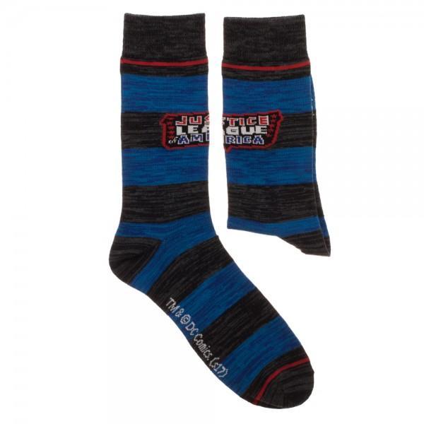 You can never have enough comic books, and you can never have enough socks. Merge your love of the two with this set of Justice League 2 Pair Blue Crew Socks. One pair is blue with reinforced red toes and heels, and the logos of the JLA characters knit into the instep and shin. The other is blue and black striped with the JLA logo on the shins.