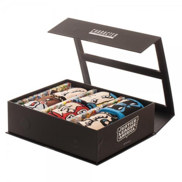 Presented in a custom printed Justice League of America gift box with clear top, this Justice League 6-pk 360 Character Crew Socks makes a great gift for DC Comics fans. It includes six pairs of allover-knit character socks: Wonder Woman, Cyborg, Superman, Aquaman, Batman, and the Flash.