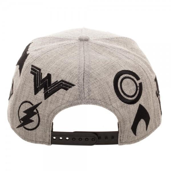 The whole Justice League America crew is represented in classic black embroidery on this gray Justice League Embroidered Acrylic Wool Snapback. A JL shield logo stands proudly on the front of the crown, and all the logos of the rest: Batman, Superman, Wonder Woman, Aquaman, the Flash, and Cyborg, cover the rest.