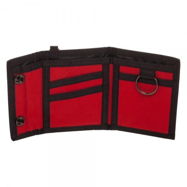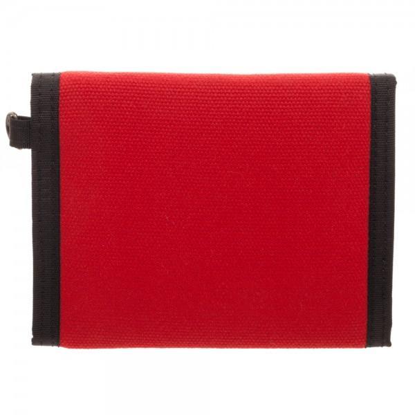 Wade Wilson can stash his chimichanga cash in this red-and-black Deadpool Canvas Tri-Fold Wallet - sometimes a merc gets hungry on a mission, man! The snappered exterior features a black-and-white Deadpool logo applique, and the interior unfolds to reveal an ID window, keyring, zippered pocket, and plenty of slots for bills and cards.