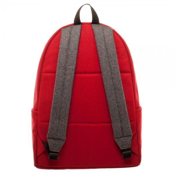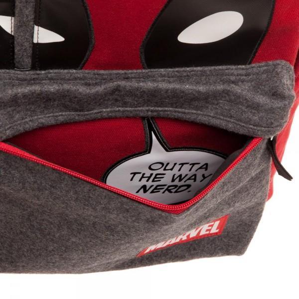 Sarcastic, stylish, and functional, this Marvel Deadpool Hidden Quote Backpack features a hidden, "Outta the way NERD" speech bubble applique hidden inside the gray front pocket. The red cotton canvas backpack also features side slide pockets, an interior laptop slide pocket for computers up to 15", and Deadpool eye mask appliques and a Marvel logo tag on the front. The bag is finished with a top carry handle and adjustable, padded shoulder straps.