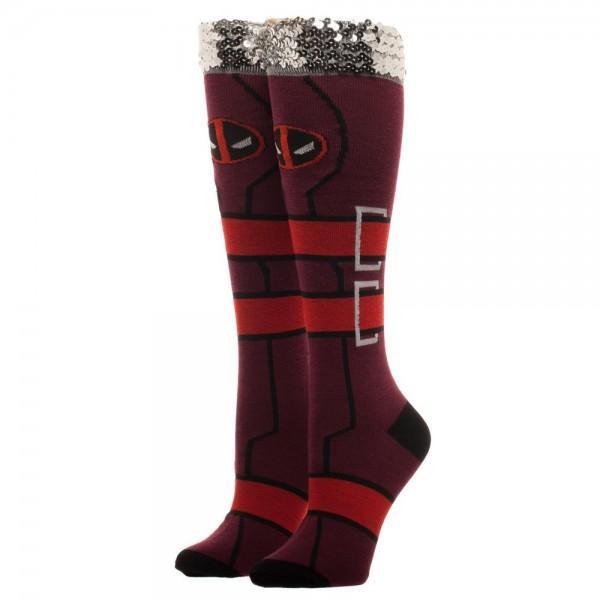 If Deadpool was Wanda Wilson, instead of Wade Wilson, she'd go nuts for these silver sequin-trimmed Marvel Deadpool Sequin Cuff Knee High Socks. Printed to look like Deadpool's signature burgundy buckled boots and finished with sequins and Deadpool logos, they're completely fabulous and covetable.