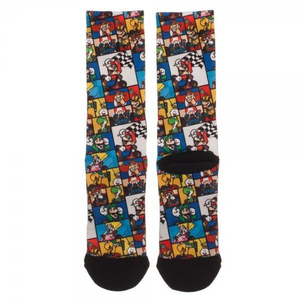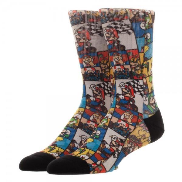 Go on a MarioKart adventure with Mario, Luigi, Bowser, Princess Peach, Yoshi, and the rest of the Mario Brothers gang, whenever you wear these SNES MarioKart Collage Sublimated Socks. A bold, full-color panel pattern of MarioKart characters adorns the foot and leg of these socks, accented with reinforced black toe and heel panels. Banana peels and ?? blocks not included.