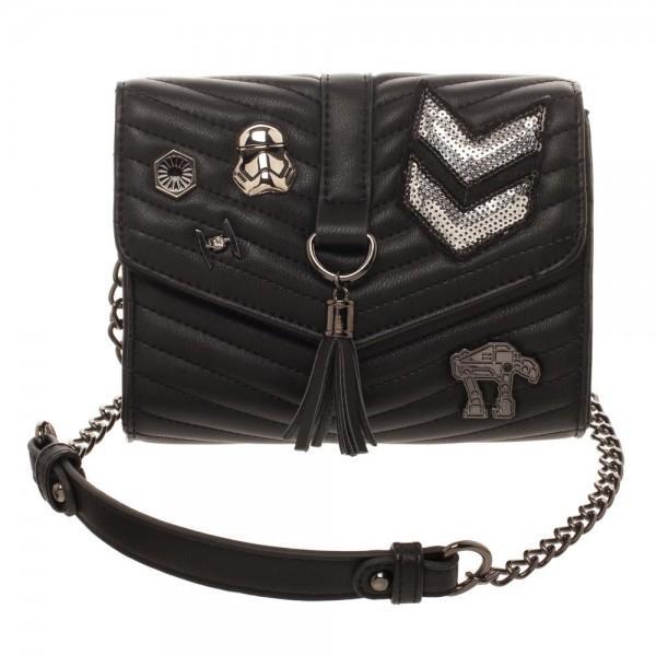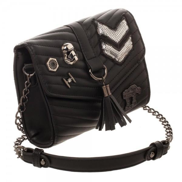 Who knew the Galactic Empire was so stylish? This Dark Side Quilted Crossbody Bag With Tassel features detailed metal charm & sequin appliques of AT-Ats, Tie Fighters, Stormtrooper Helmets, and more. The magnetic snap closure is accented with a tasseled charm, and the bag also includes a removeable chain crossbody strap.