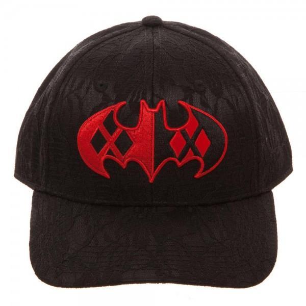 Devious Harley Quinn would, if she could, rid the world of Batman forever so that she and Joker could have a neverending Bonnie & Clyde-style crime spree. This black lace Harley Quinn Lace Dad Hat features a Batman logo embroidered in red with Harley Quinn's signature black and red diamonds - foreshadowing, possibly? "Harley Quinn" is also embroidered in red on the back, over the adjustable buckle strap.