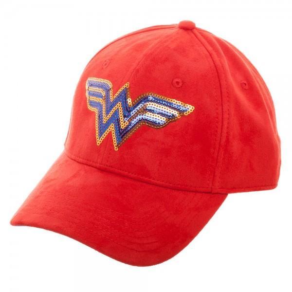 Even ball caps can be blingy - just look at this awesome Wonder Woman Sequin Suede Traditional Cap! The red suede baseball cap features the Wonder Woman logo in gold and blue metallic sequins, plus "Wonder Woman" embroidered in gold block letters over the adjustable back buckle strap.