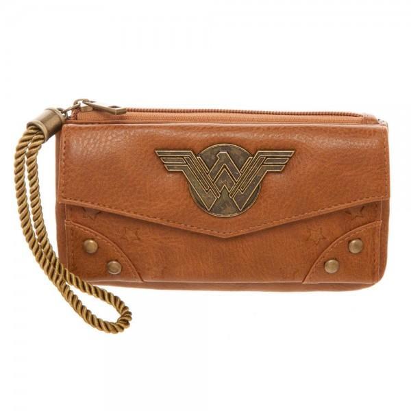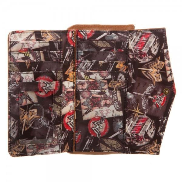 There's something for any and all Wonder Woman fans in this zip top wallet. The outside features a simple and stylish tan design with a metal Wonder Woman logo on the front. Inside is where there's a real treat, with full color Wonder Woman designs, symbols, and posters add a fun pop to the wallet. Plus there's room for all your cash, cards and ID inside.