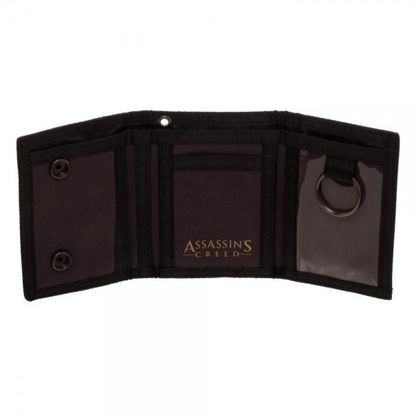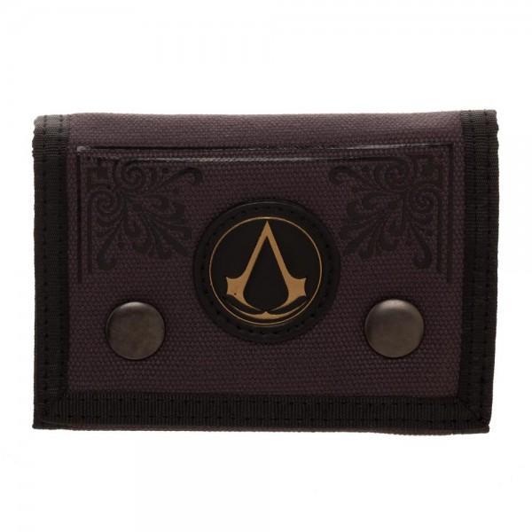 Keep your money safe from the Templars in this rugged, dark brown Assassin's Creed Canvas Tri-Fold Wallet. Accented with a gold-and-black AC logo applique and black scrollwork detailing, it snaps securely open and shut, and features deep heel & toe pockets for greater comfort when stashed in your pockets. The interior features a transparent ID window, D-ring keyring tag, and multiple slots for cards and cash.