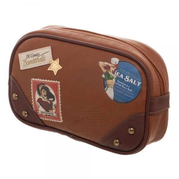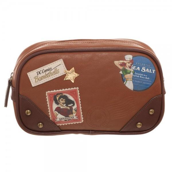 The original DC Comics Bombshells are rendered in a vintage-style print on this DC Comics Bombshell Makeup Bag. Vintage travel stickers of Diana Prince (Wonder Woman), Hawkgirl, and more are accented by printed roses and hawk & star appliques. Features brass-tone studs and hardware, dark brown trim, and an exterior slip pocket.