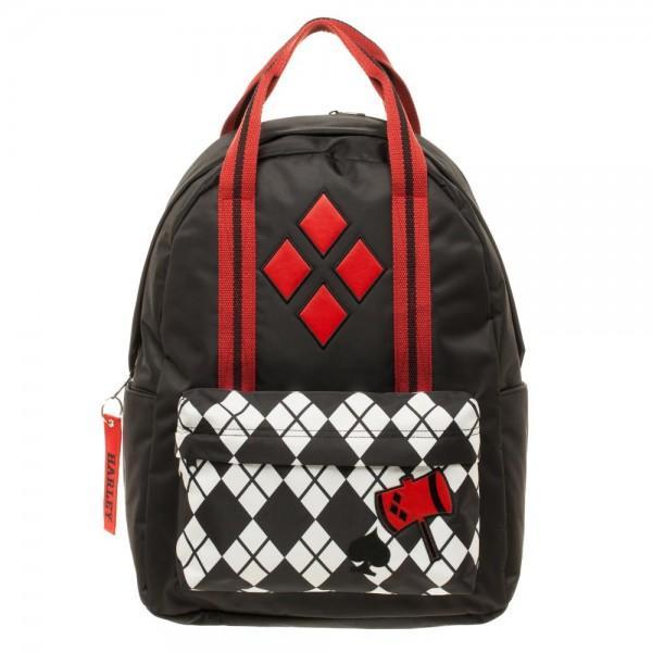 Hey, Puddin'! Daddy's Little Monster has a lot of stuff to carry, and this DC Comics Harley Quinn Pocket w/ Top Handle Backpack does it in style. The black nylon bag has a red-and-black striped top carry handle, red diamond harlequin, black spade, and Harley's signature mallet appliqu’___s. The main zippered compartment is accented with a red "Harley" tag. A black-and-white argyle-printed front pocket adds extra storage space and organization.